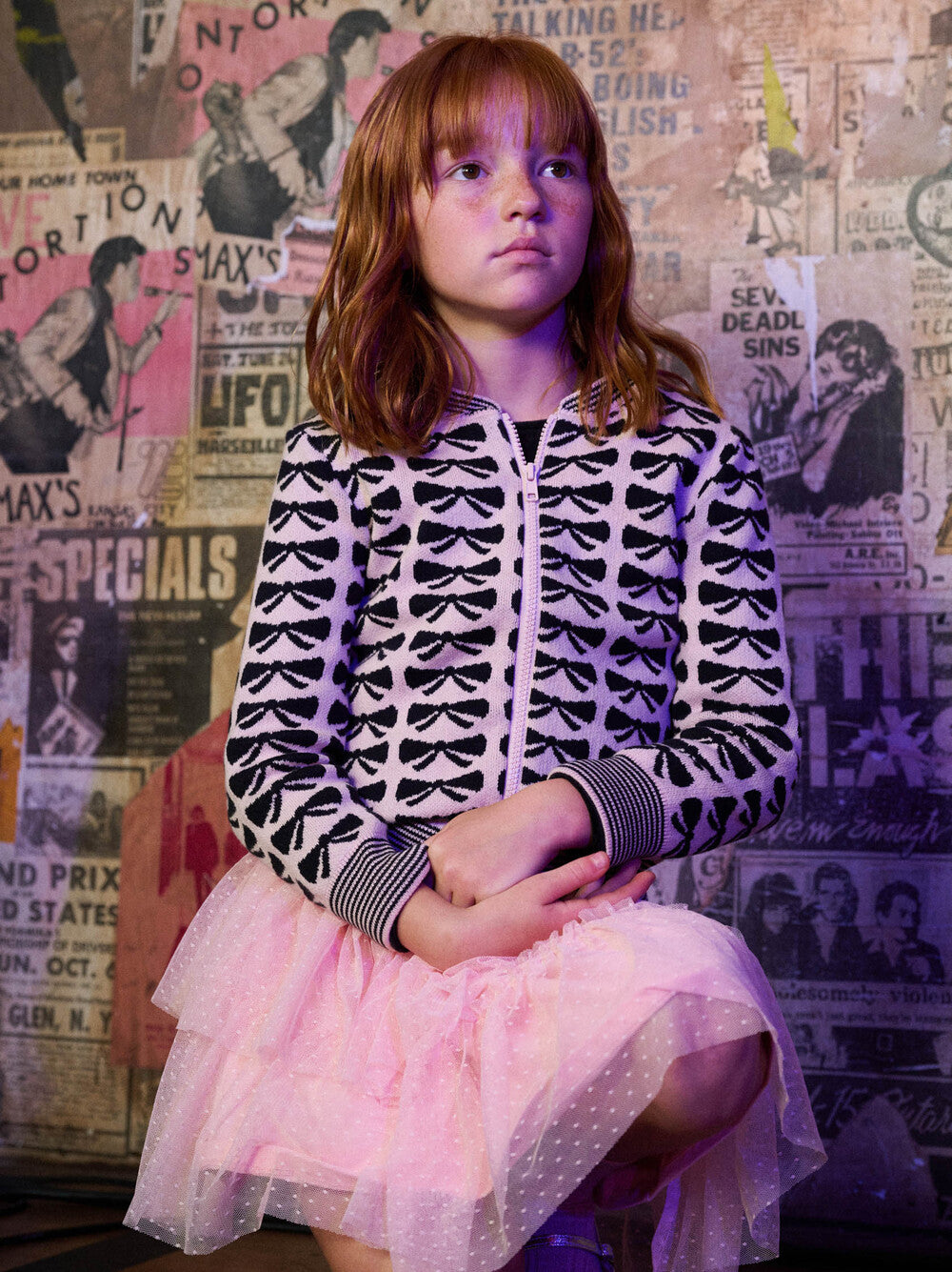 A charming layering piece with a bold twist, this standout cardigan channels playful polish with a dash of K-pop flair. Inspired by the vibrant style and energy of South Korean street fashion, the allover bow pattern brings whimsical charm to a sporty silhouette. Crafted from soft 100% cotton, it features a zip-up front for easy on-and-off and striped rib trim at the neckline, cuffs, and hem for a touch of retro-cool. The standard fit and high-hip length make it a versatile piece for layering over dresses or pairing with leggings on cooler days. Finished with a built-in name tag--perfect for school days or passing down to little siblings.